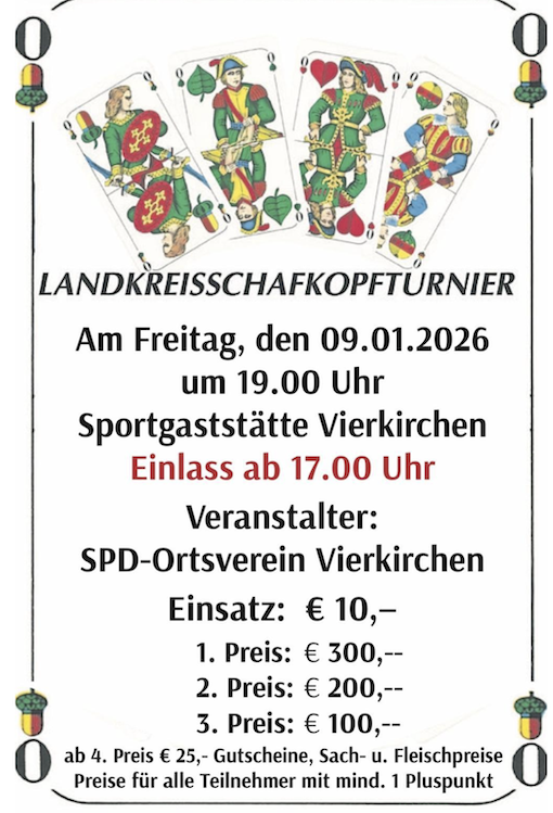 1.Preis 150,- Euro ab 9 Tischen garantiert. Bis zu 8 Tischen 100,- Euro. Ab 14 Tischen für den 1. Preis 200,- Euro. Weitere Geldpreise absteigend. Anmeldung, gerne auch telefonisch, von 18.00 Uhr bis 18.50 Uhr. In den letzten 10 Minuten wird kein neuer Tisch eröffnet, außer es kommen weiter Spieler, die einen neuen 4er Tisch bilden. Für das leibliche Wohl ist bestens gesorgt.