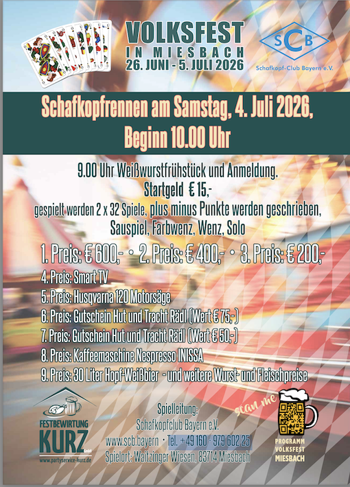 9. Preis: 30 Liter Hopf Weißbier • und weitere Wurst und Fleischpreise gespielt werden 2 x 32 Spiele, plus minus Punkte werden geschrieben,